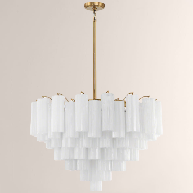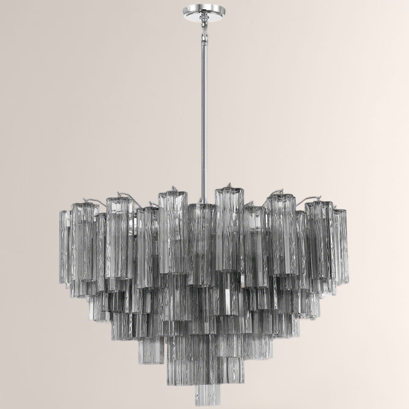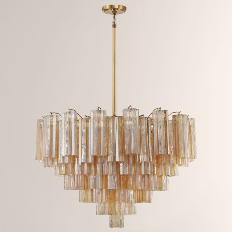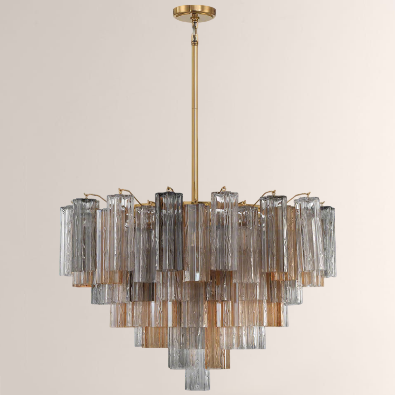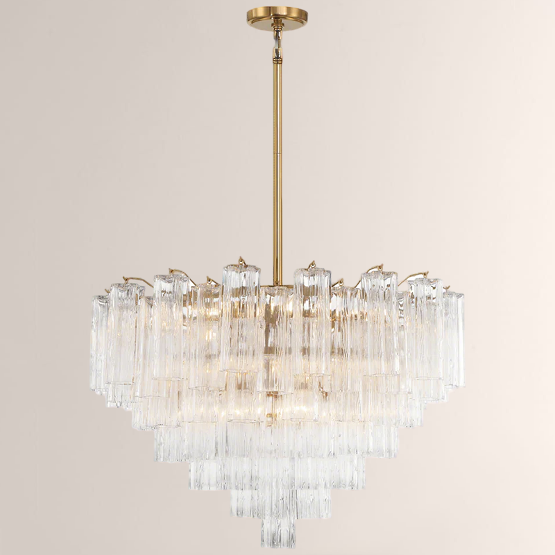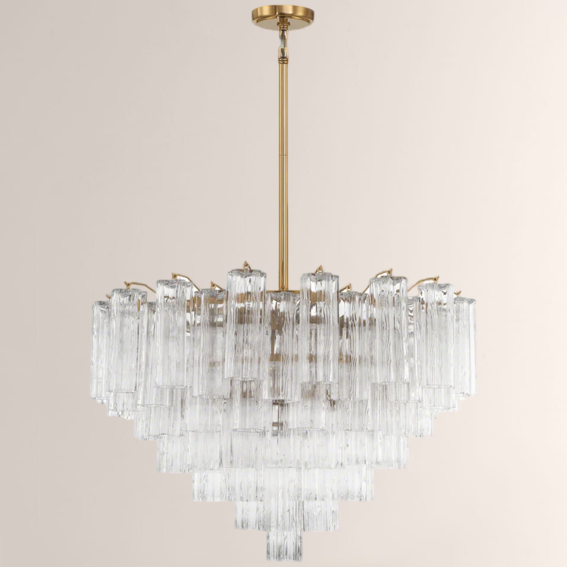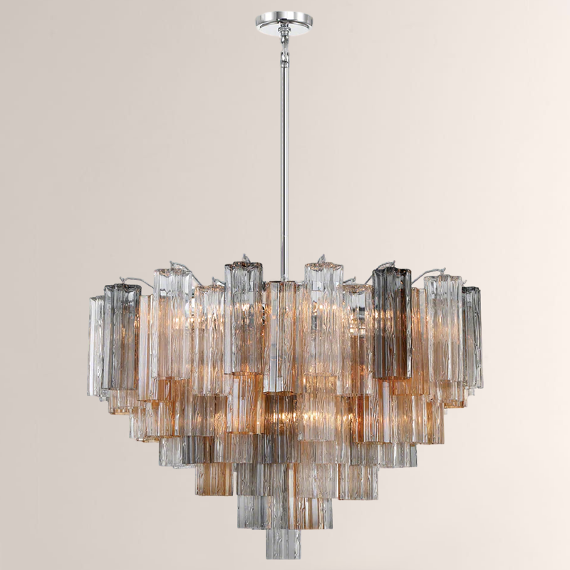 The captivating Addens Lighting Collection is a modern-day interpretation of the iconic mid-century Tronchi chandelier. Inspired by its predecessor's sleek lines and geometric shapes, the Addens features a polished nickel or Aged Brass metal frame that exudes sophistication and style. Its unique design showcases transparent tiers of textured Tronchi glass tubes, forming a mesmerizing 5-point rounded star shape. Choose from a range of glass colors, including clear, amber, smoke, and white, or the stunning Autumn option, which features a captivating multicolor disposition of amber, clear, and smoke Tronchi glass. The Addens Lighting Collection offers various sizes and finishes, allowing you to find the perfect fit for your space while adding a touch of timeless elegance. |
