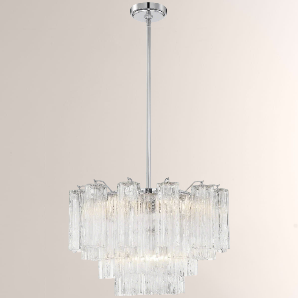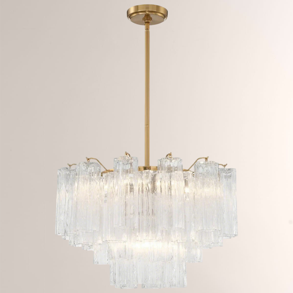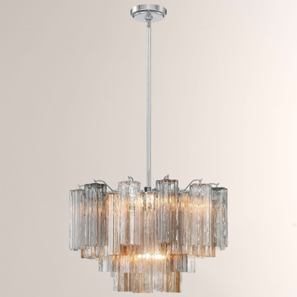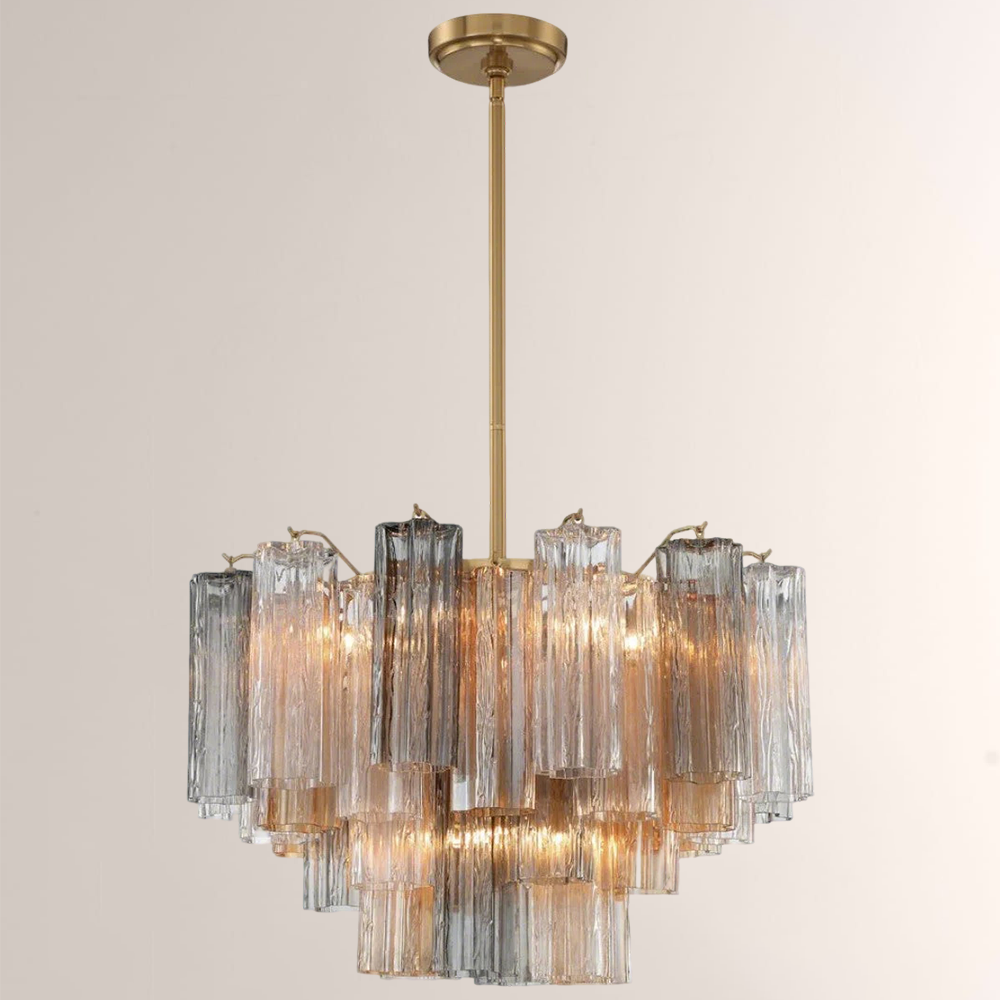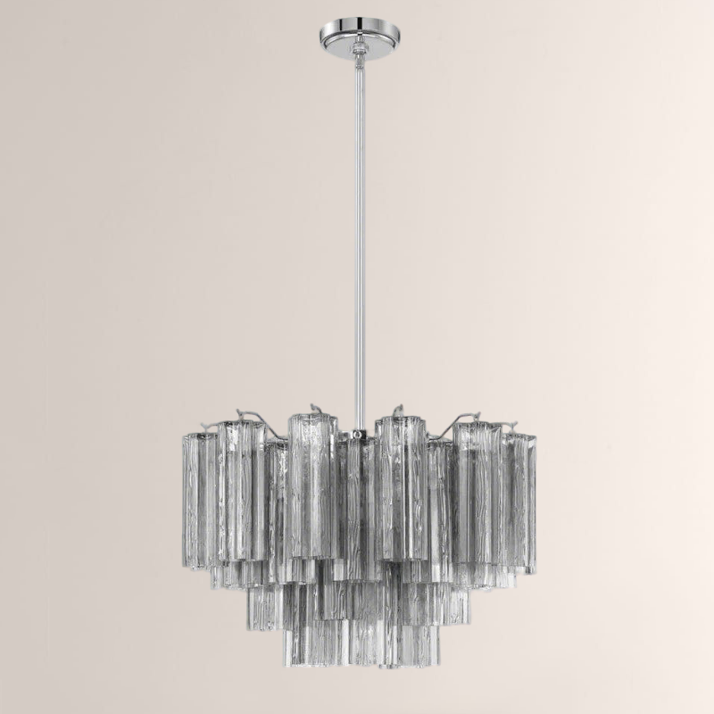 The captivating Addens Lighting Collection is a modern-day interpretation of the iconic mid-century Tronchi chandelier. Inspired by its predecessor's sleek lines and geometric shapes, the Addens features a polished nickel or Aged Brass metal frame that exudes sophistication and style. Its unique design showcases transparent tiers of textured Tronchi glass tubes, forming a mesmerizing 5-point rounded star shape. Choose from a range of glass colors, including clear, amber, smoke, and white, or the stunning Autumn option, which features a captivating multicolor disposition of amber, clear, and smoke Tronchi glass. The Addens Lighting Collection offers various sizes and finishes, allowing you to find the perfect fit for your space while adding a touch of timeless elegance.