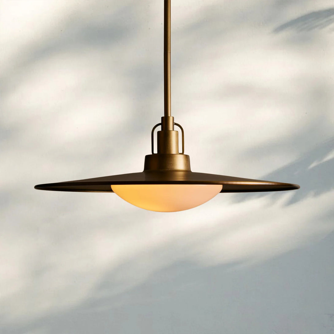 Forged from iron with a lustrous brass finish, our Argent Lighting Collection displays a modern-yet-simple silhouette. Featuring a distinctive disc-shaped shade, complemented by an opal glass dome that diffuses a soft glow, Argent adds a minimalistic flare to any setting.