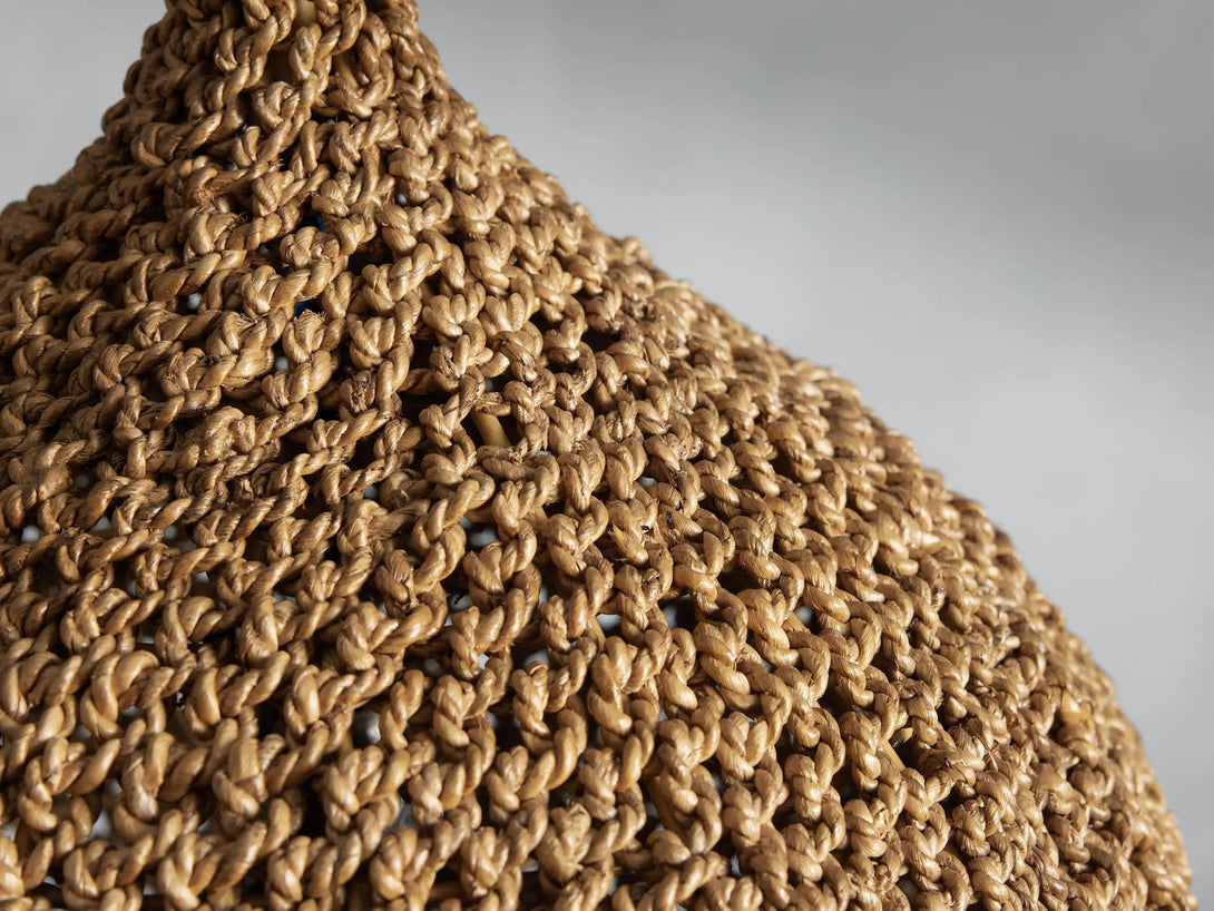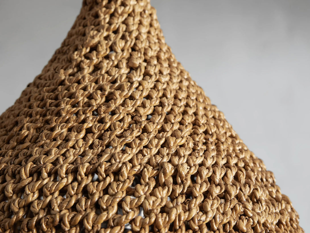 - Crafted from handwoven natural banana rope wrapped around a metal frame with a plated brass canopy.