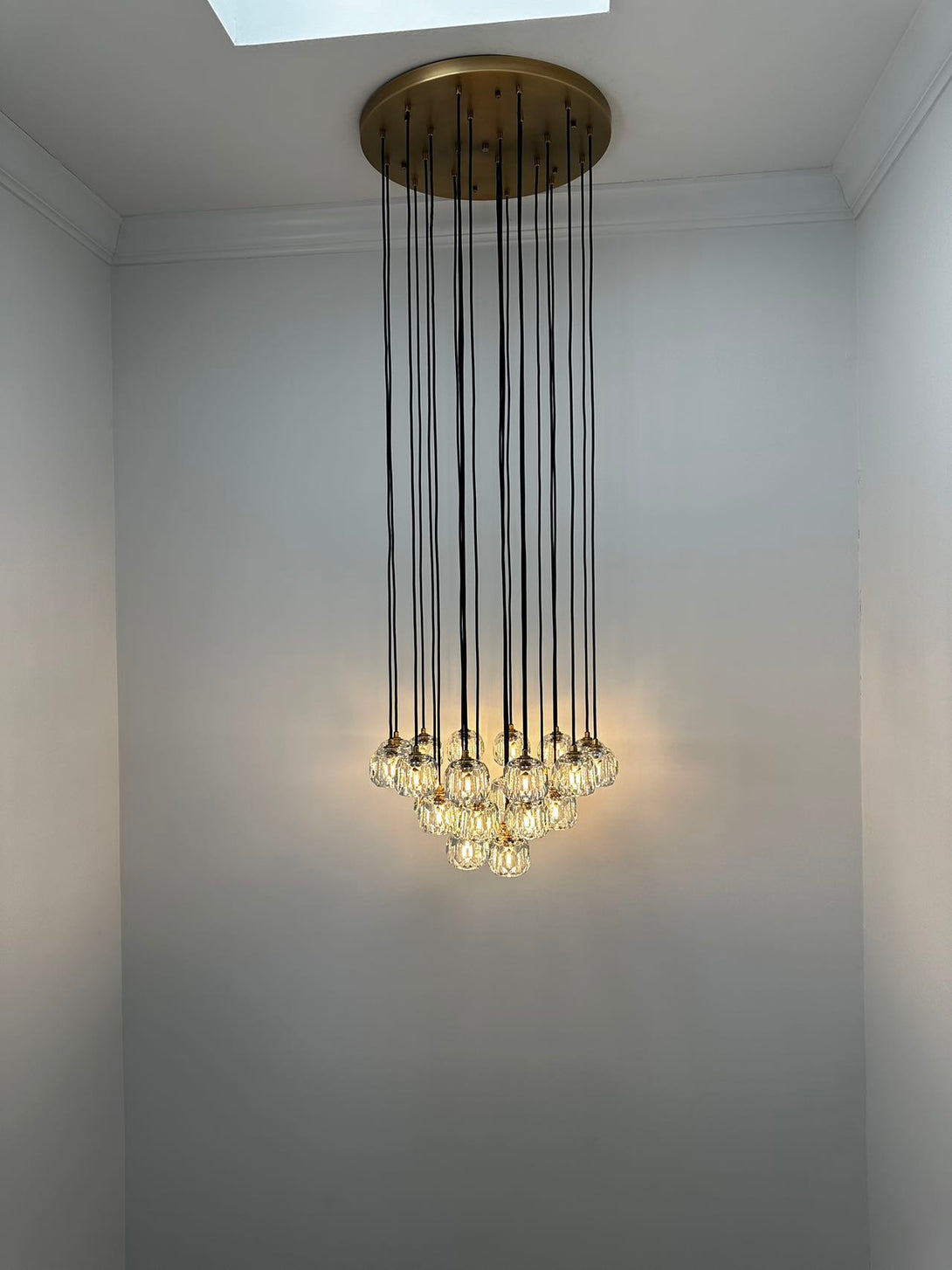 Crafted of solid brass and crystal glass, the sculptural fixture is a testament to our passion for luxe materials and superior craftsmanship. Evoking the minimalist spirit of 1960s design, each finely faceted sphere is ground and polished by hand to reflect and refract the light. |