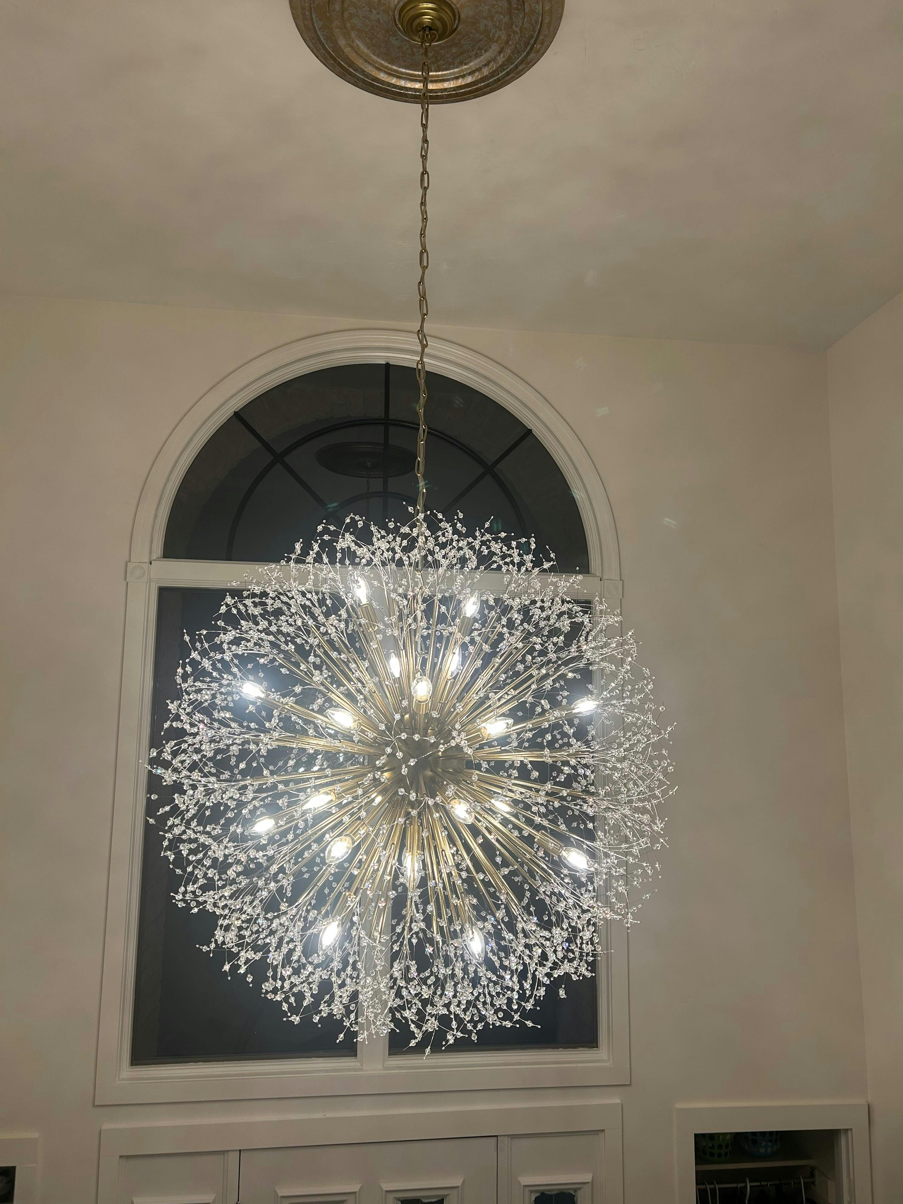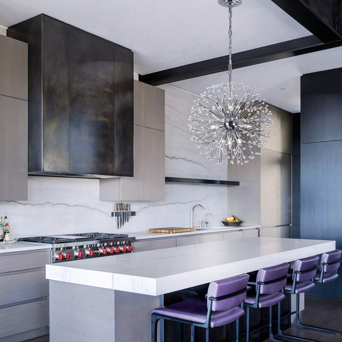 Delightfully designed to resemble a dandelion after it’s blossomed, our elegant Dandelion Chandelier beautifully twinkles with reflected light. Crafted from nickel-plated iron with a painted finish, Dandelion’s radiating crystals will add whimsical wonder to any space.
