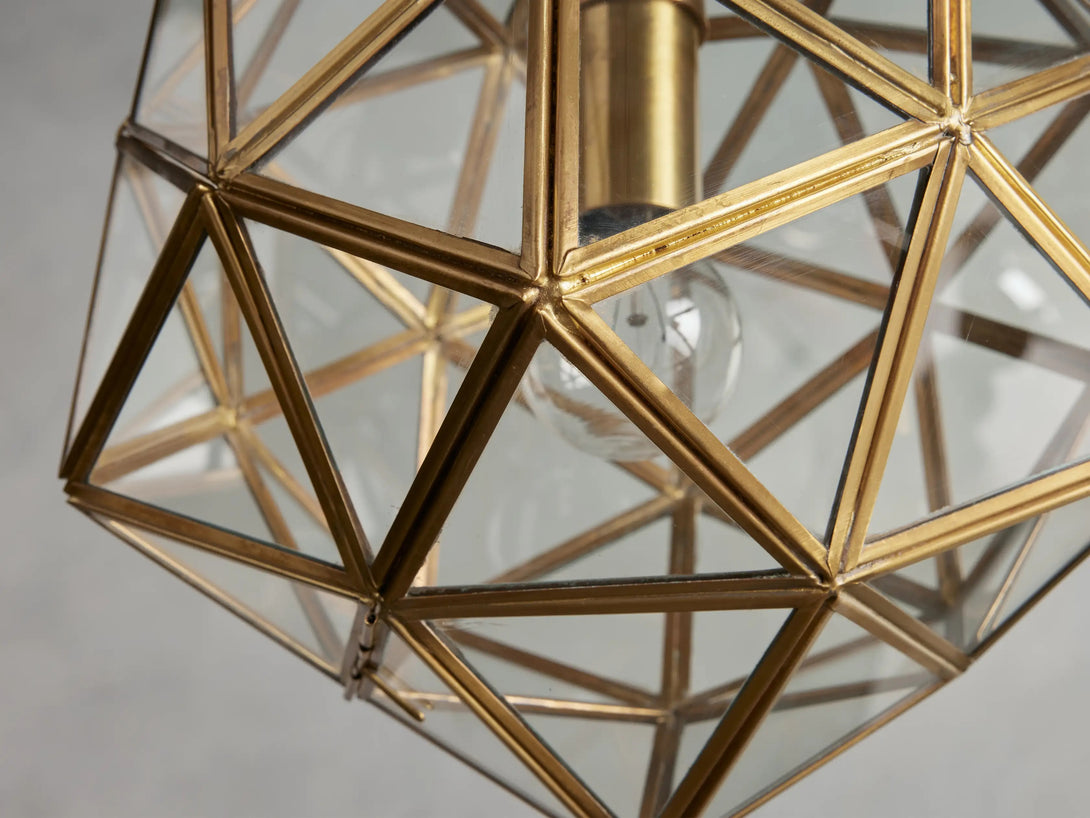 Crafted by Indian artisans from hand-welded brass, our brilliantly elegant Eliana Lantern Pendant features a beautifully faceted, geometric design that will illuminate any space with style and ambiance.