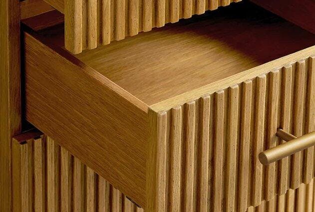 - Hand-stained finishes on reeded wood surfaces include a protective lacquer coating for subtle sheen.