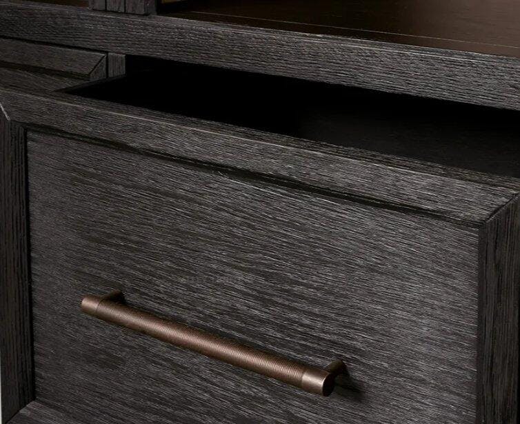 - Doors are accented by exposed hinges and reeded hardware—antiqued for a subtle, time-worn appearance.