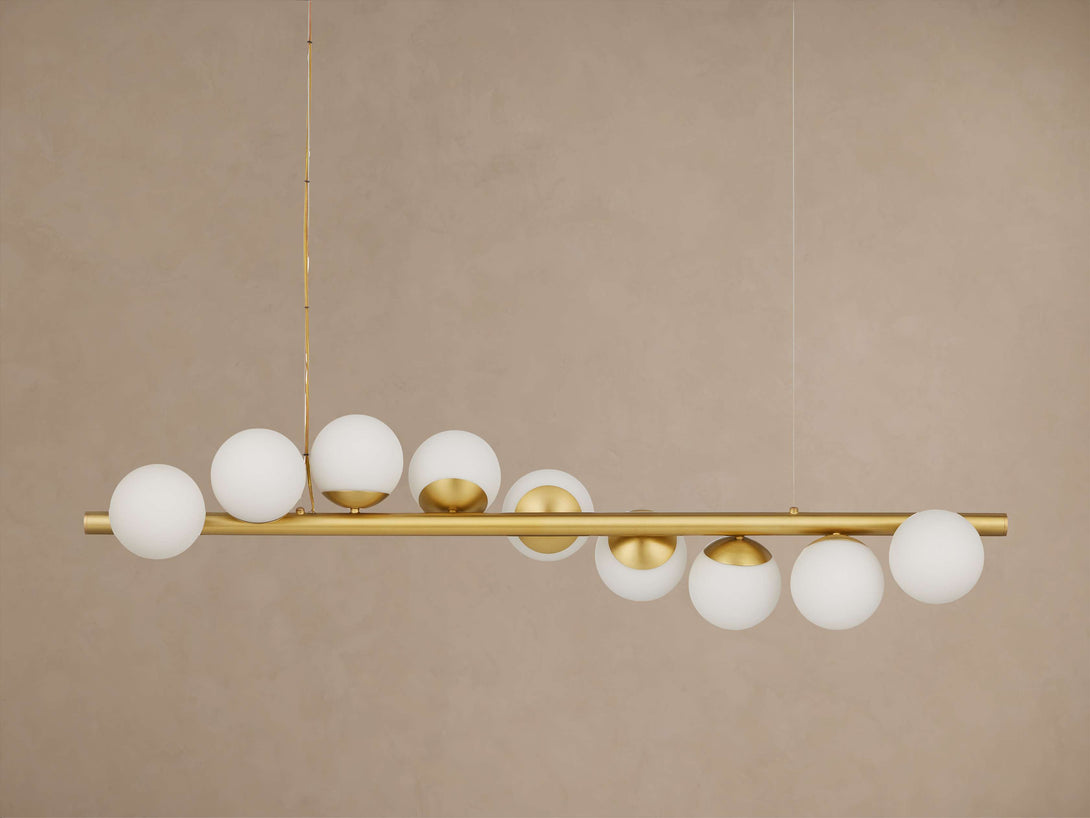 Our Kinney Linear Chandelier showcases softly glowing globes that punctuate a brushed brass armature in a fluid arrangement, turning ambient light into a dynamic, elevated moment.