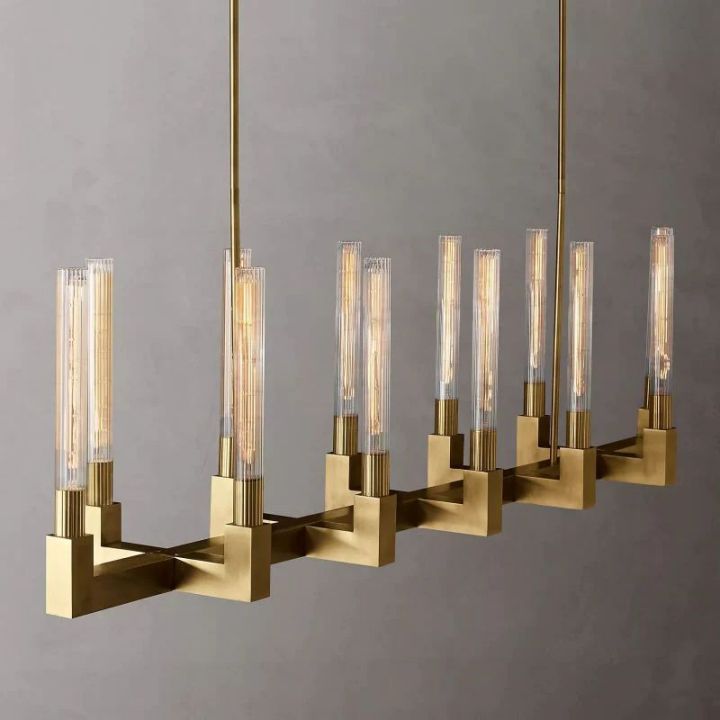 The collection chandelier is reinterpreted in brass and defined by clean lines and sharp angles, the fixture's elegant ribbed-glass hurricanes showcase Edison filament bulbs, shimmering like candles within. |