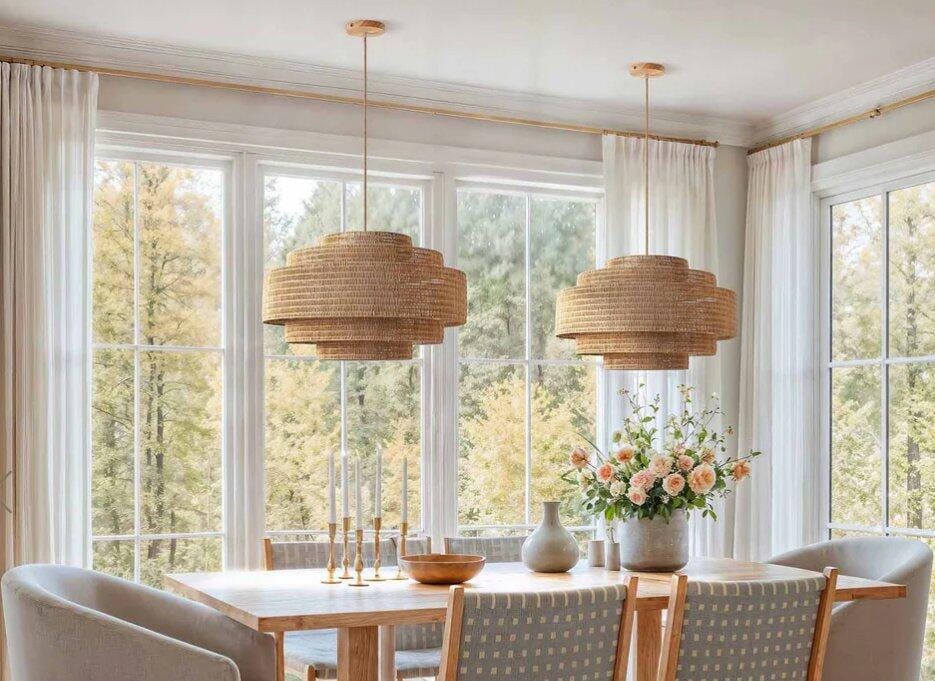 The tiered, handwoven rattan shade of our Paloma Chandelier enhances any living or dining space with a touch of organic texture.