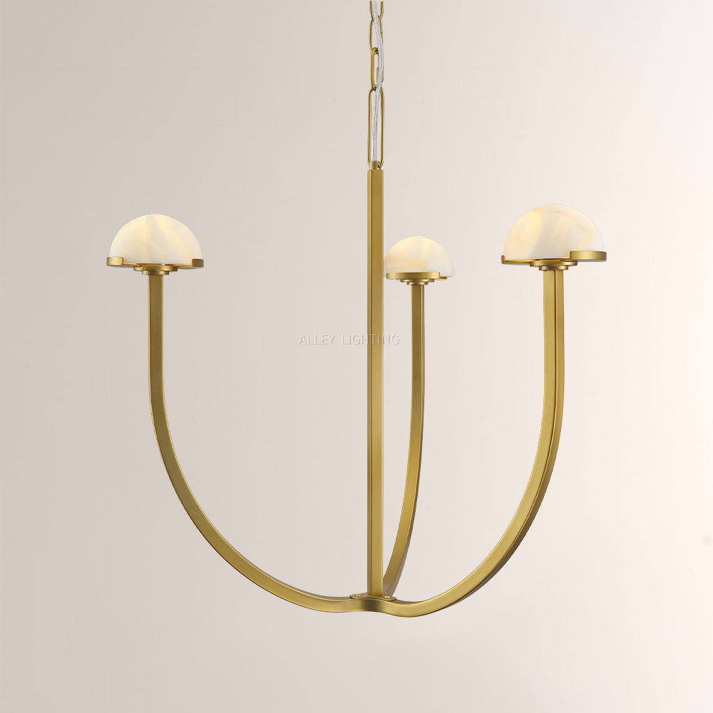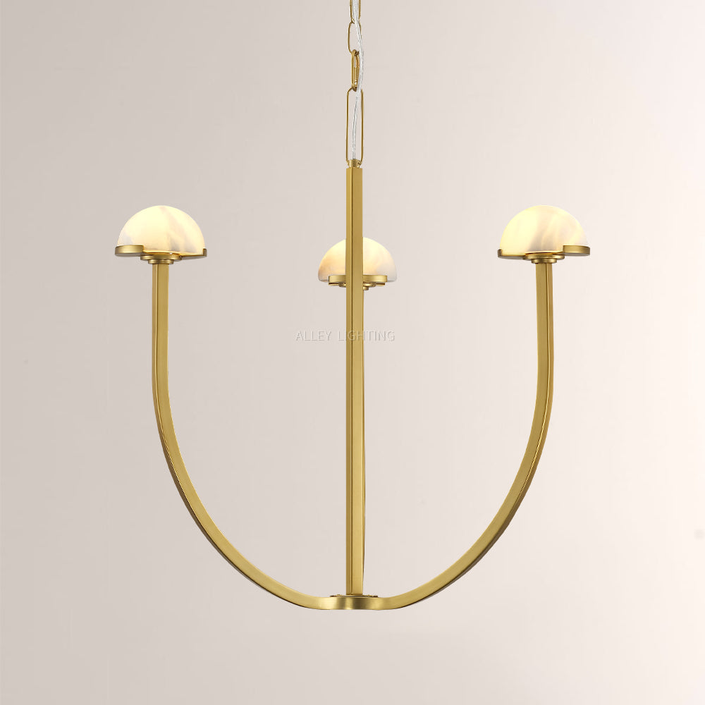 Minimalist in design yet maximalist in effect, our lighting collection was inspired by a midcentury Italian silhouette. Metal armatures reminiscent of architectural tracery support a constellation of dome-shaped, translucent alabaster shades that highlight the stone's natural veining and coloration. The sculptural form emits a warm, filtered glow.