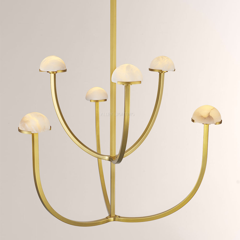 Minimalist in design yet maximalist in effect, our lighting collection was inspired by a midcentury Italian silhouette. Metal armatures reminiscent of architectural tracery support a constellation of dome-shaped, translucent alabaster shades that highlight the stone's natural veining and coloration. The sculptural form emits a warm, filtered glow.