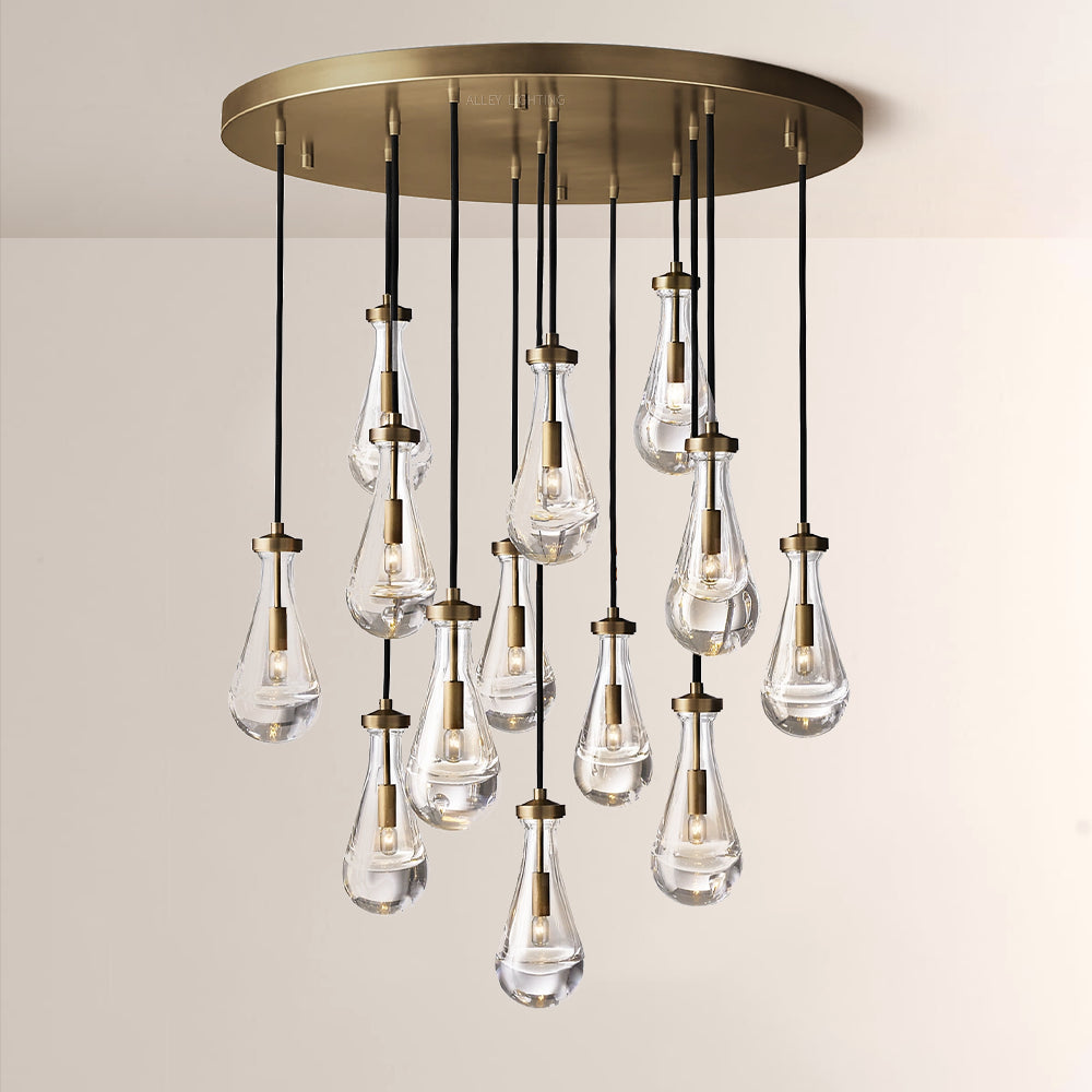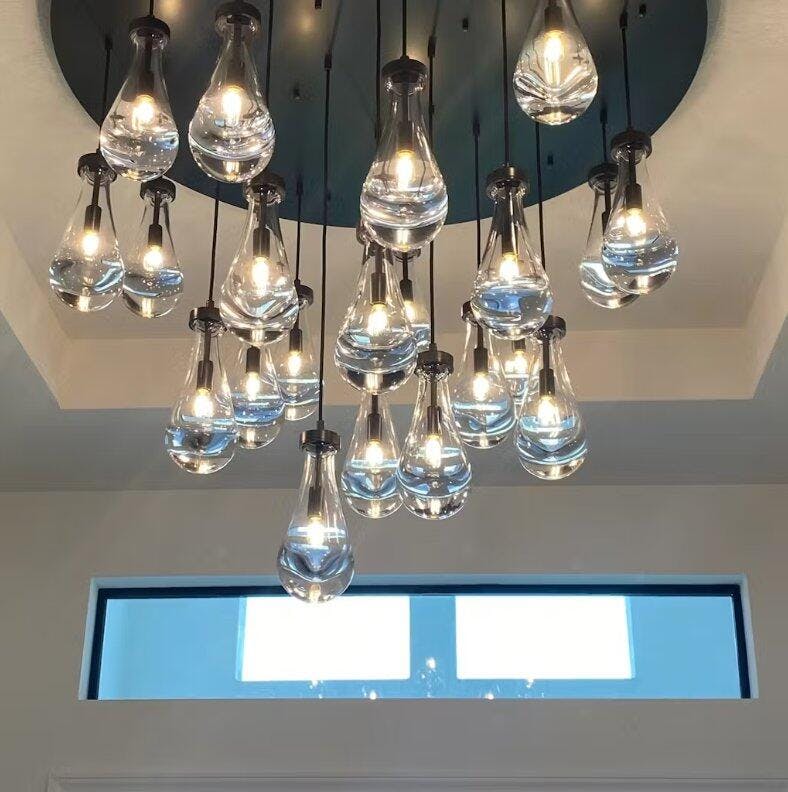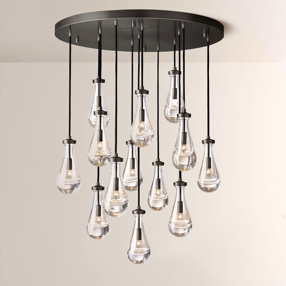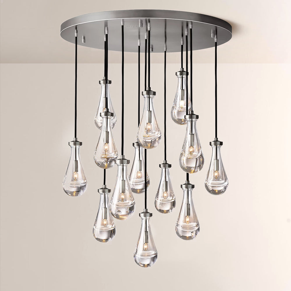 Much like the rhythm of a rainstorm itself. Suspended from slim black cords, drops of blown glass encase the bulbs – creating the illusion of underwater illumination – and cast luminous ripples that wash across ceilings and walls.