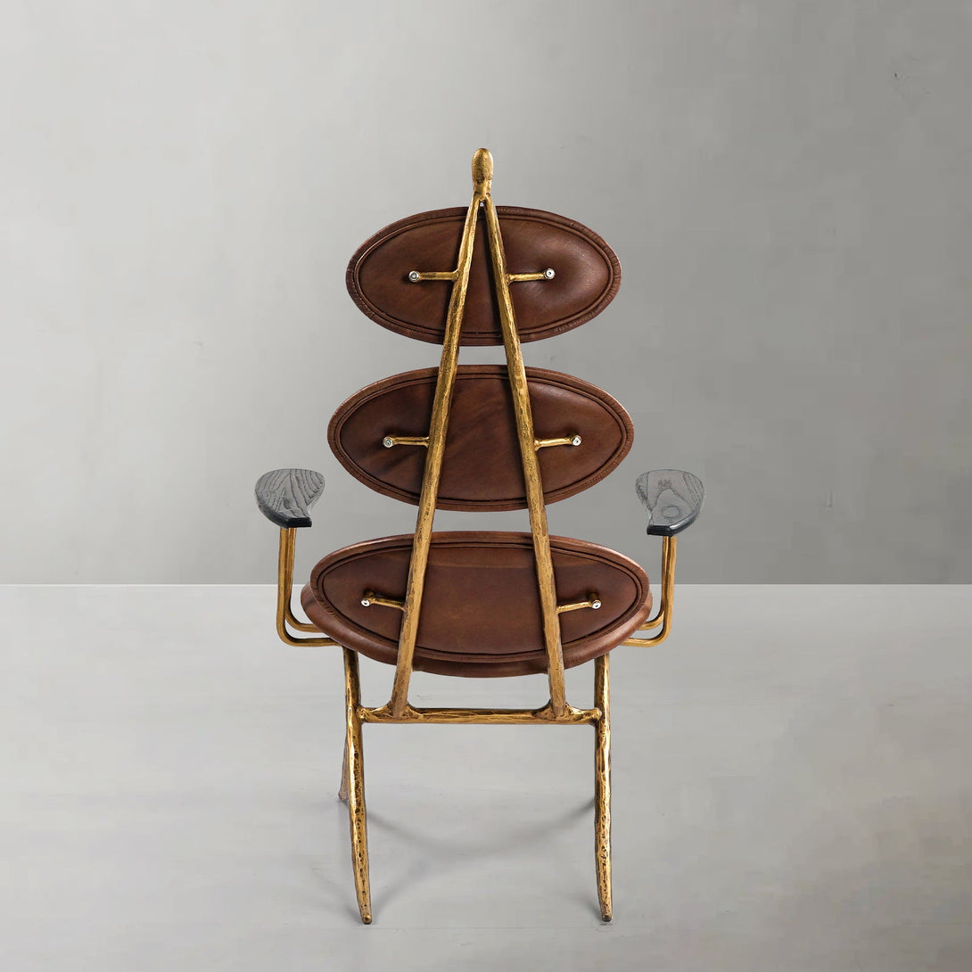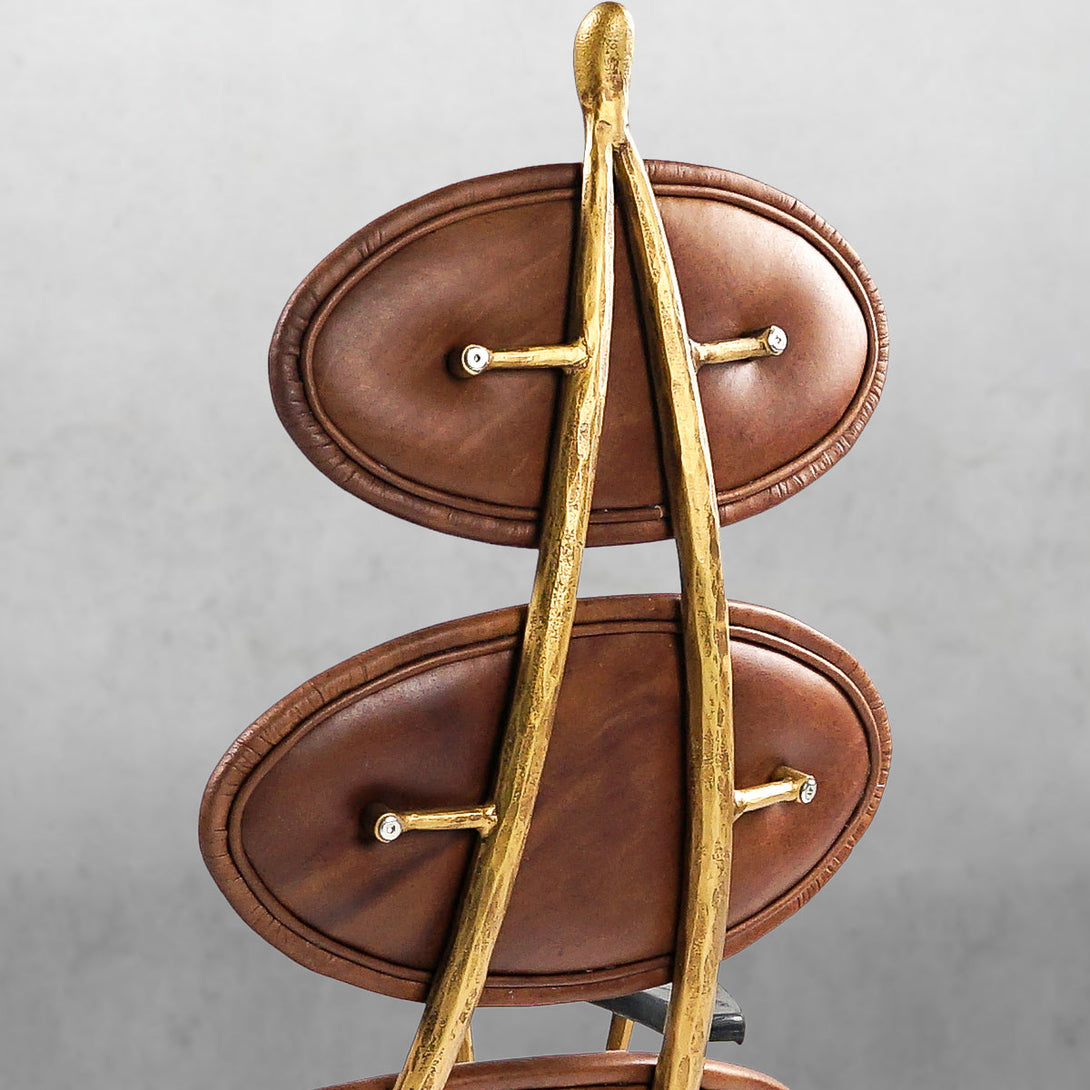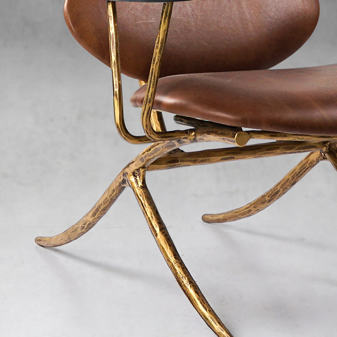 Our chair from the rustic sensibility of a hand-forged metal base with supple leather. Employing an ancient fabrication process, artisans hand hammer the metal bars to reveal an alive, imperfect and organic texture, a counterpoint to the frame's slender, tapered silhouette.