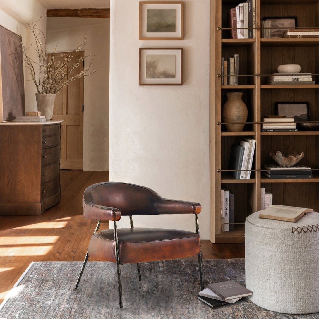 Our chair from the rustic sensibility of a hand-forged metal base with supple leather. Employing an ancient fabrication process, artisans hand hammer the metal bars to reveal an alive, imperfect and organic texture, a counterpoint to the frame's slender, tapered silhouette.