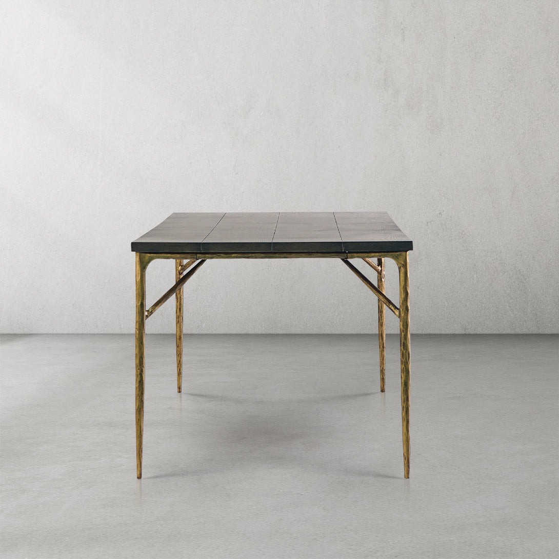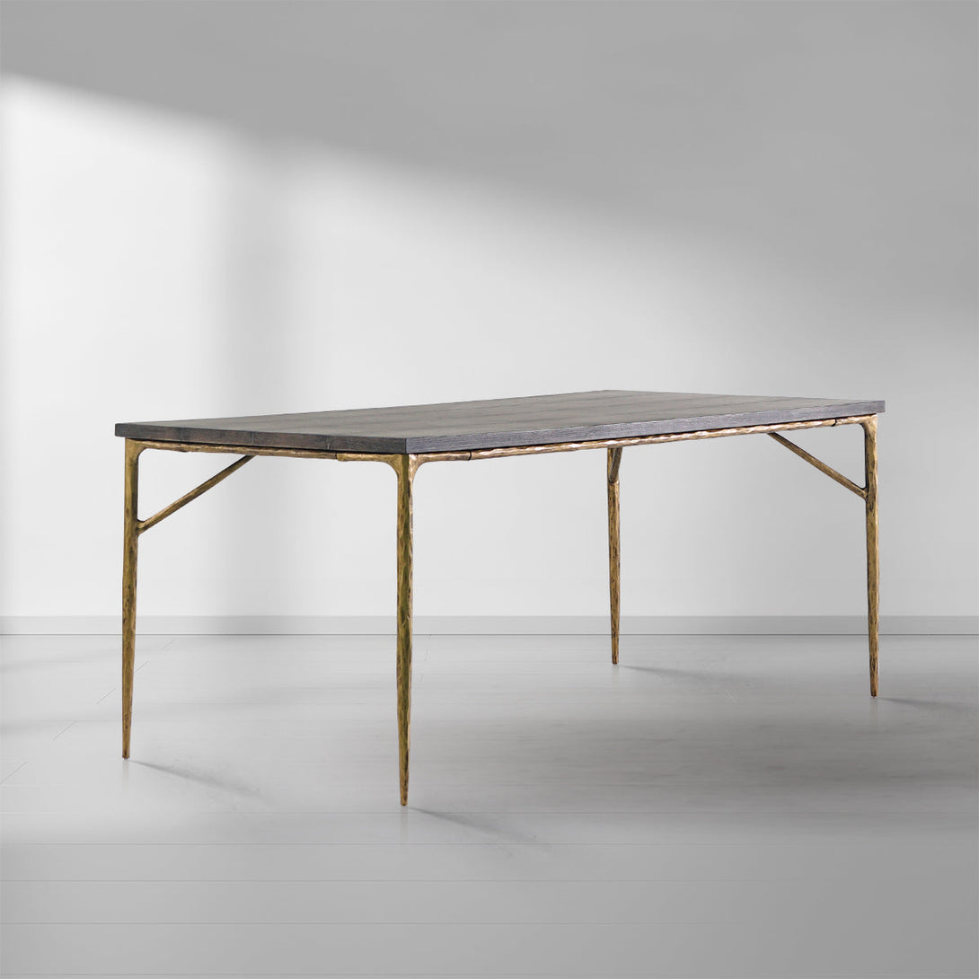 This rectangular dining table uses contrasting materials to create a unique industrial modern design. The solid wood countertop is supported by a slender vintage copper and iron frame for a transparent appearance.