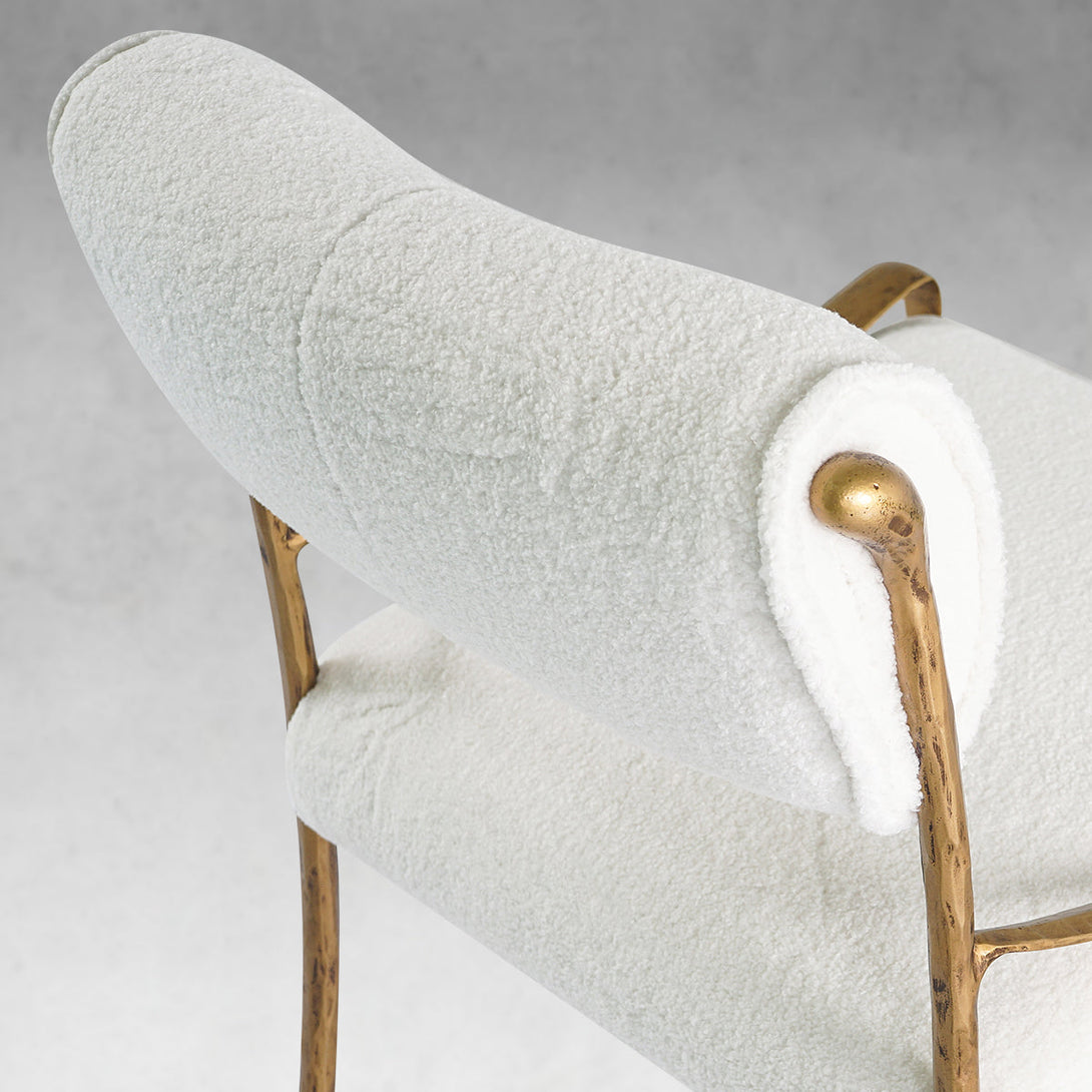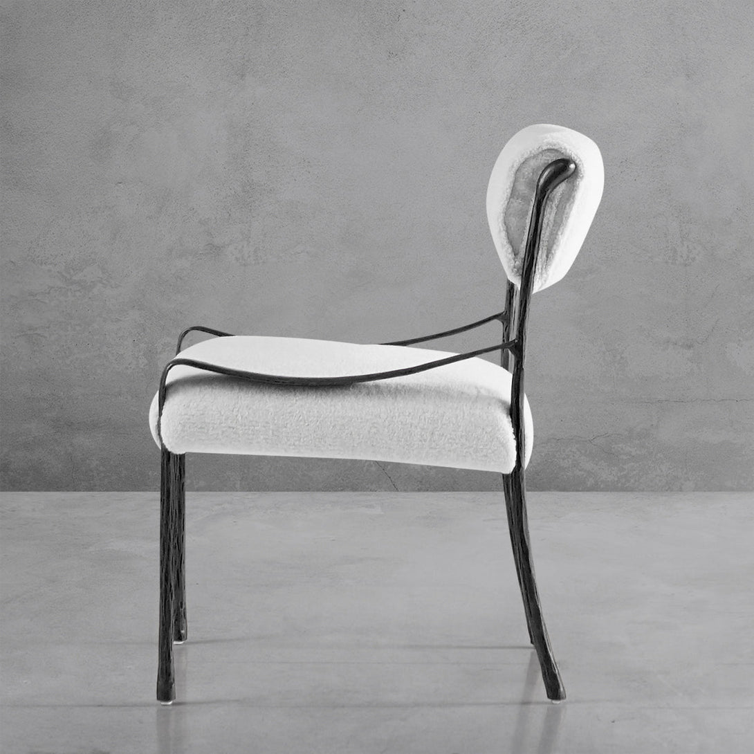 Our chair from the rustic sensibility of a hand-forged metal base with tailored upholstery. Employing an ancient fabrication process, artisans hand hammer the metal bars to reveal an alive, imperfect and organic texture, a counterpoint to the frame's slender, tapered silhouette.