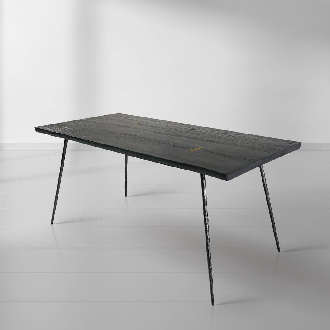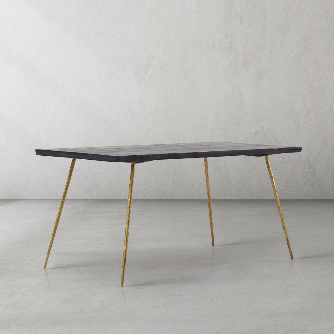 This rectangular dining table uses contrasting materials to create a unique industrial modern design. The solid wood countertop is supported by a slender vintage copper and iron frame for a transparent appearance.