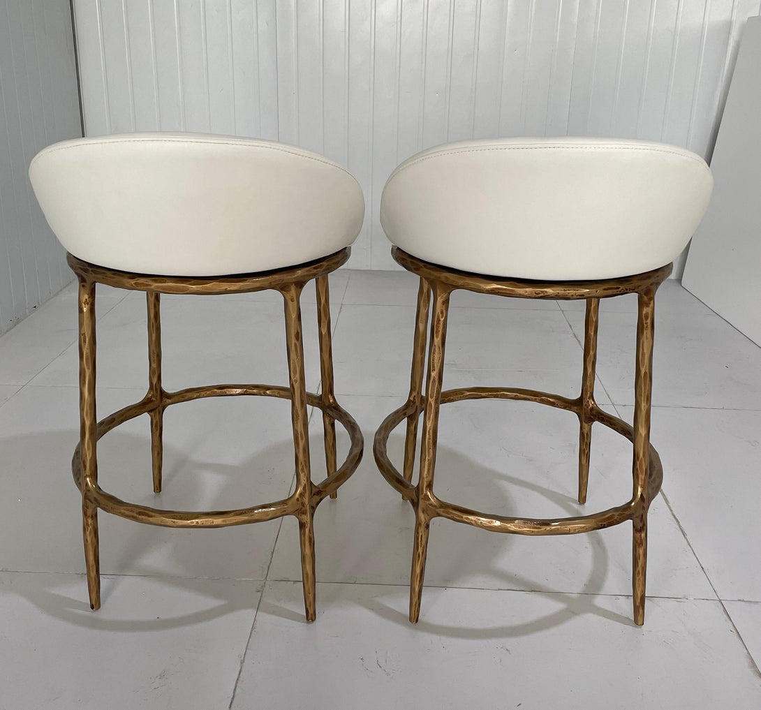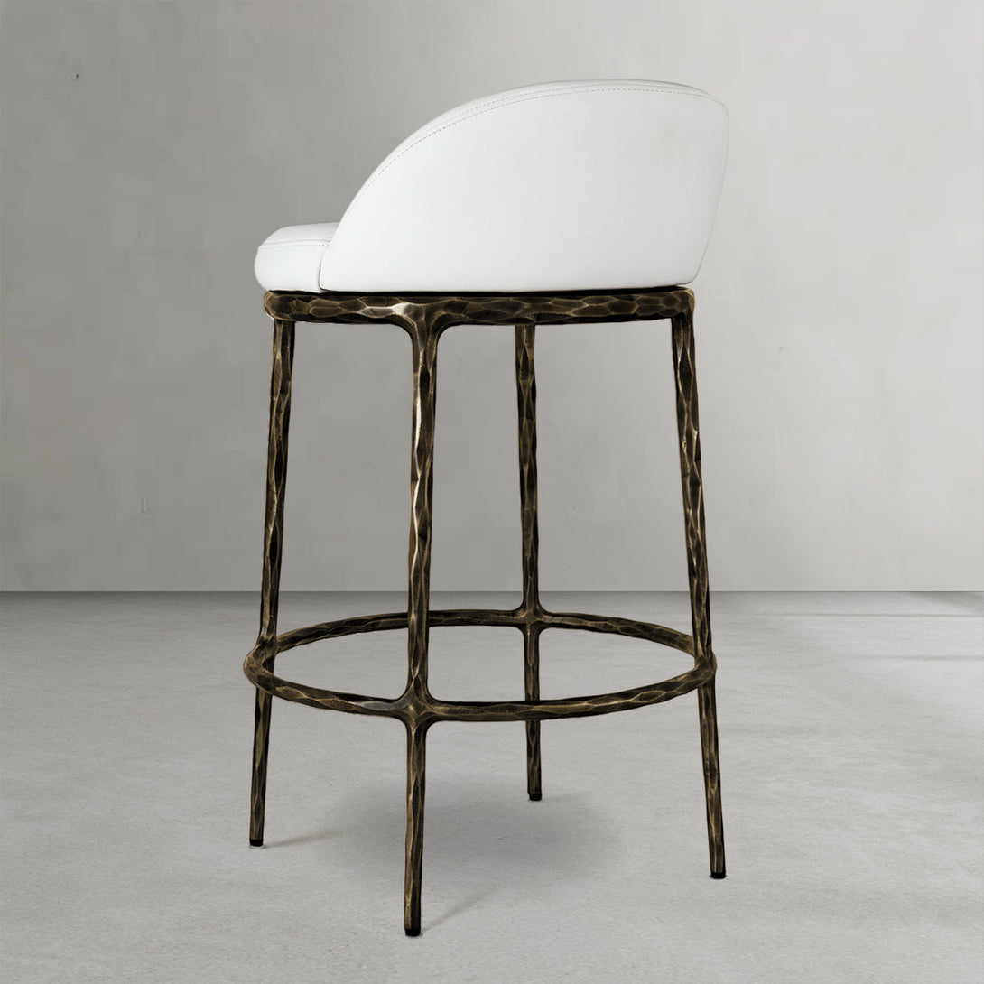 Our stool from Alexander merges the rustic sensibility of a hand-forged metal base with tailored upholstery. Employing an ancient fabrication process, artisans hand hammer the metal bars to reveal an alive, imperfect and organic texture, a counterpoint to the frame's slender, tapered silhouette.