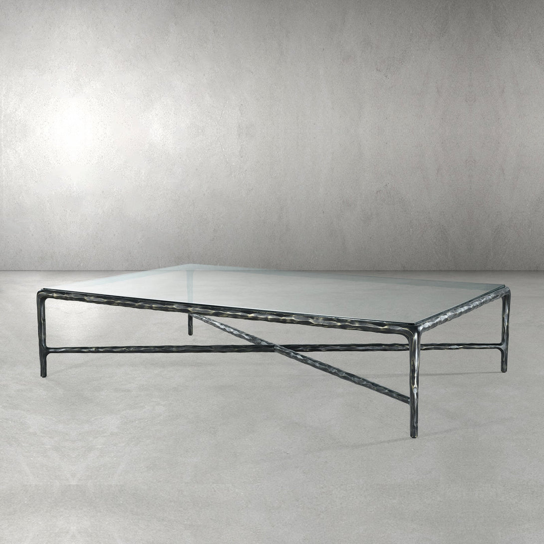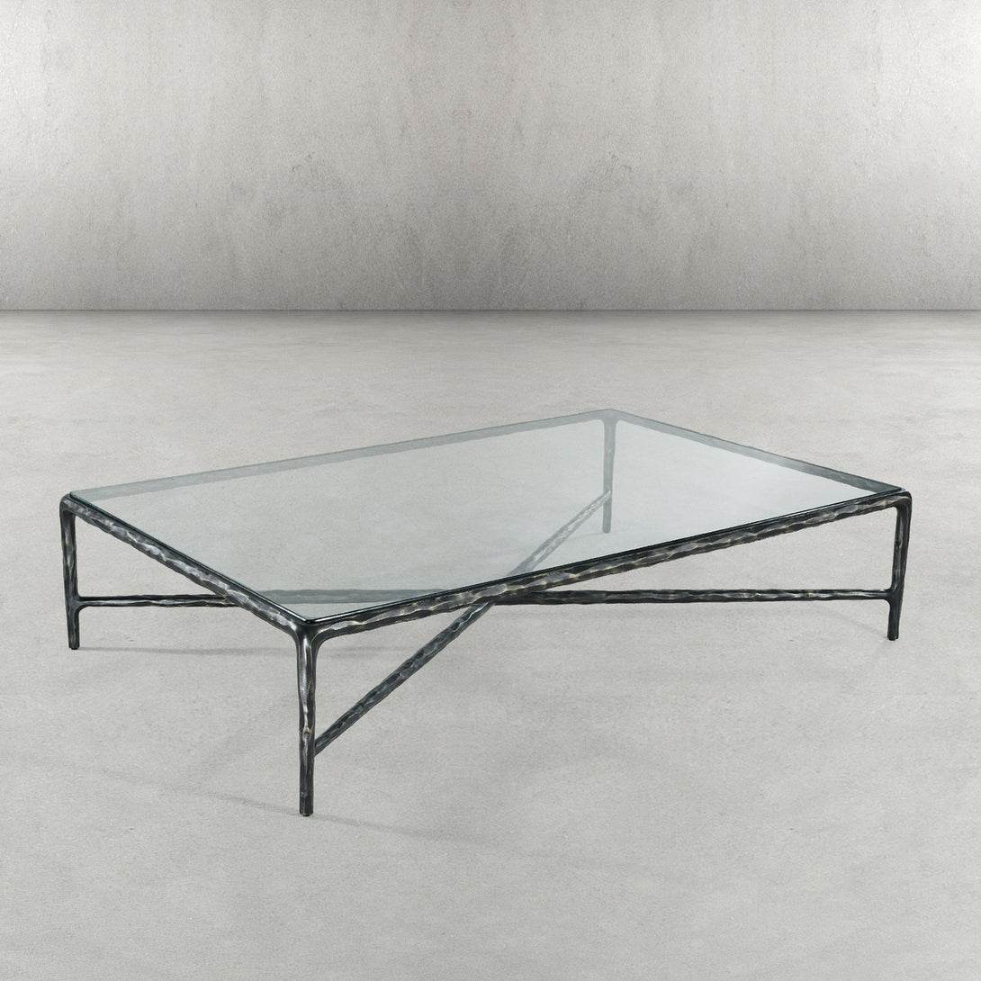 Our collection by the rustic sensibility of a hand-forged metal base with a clear glass top. Employing an ancient fabrication process, artisans hand hammer the metal bars to reveal an alive, imperfect and organic texture, a counterpoint to the frame's slender, tapered silhouette.